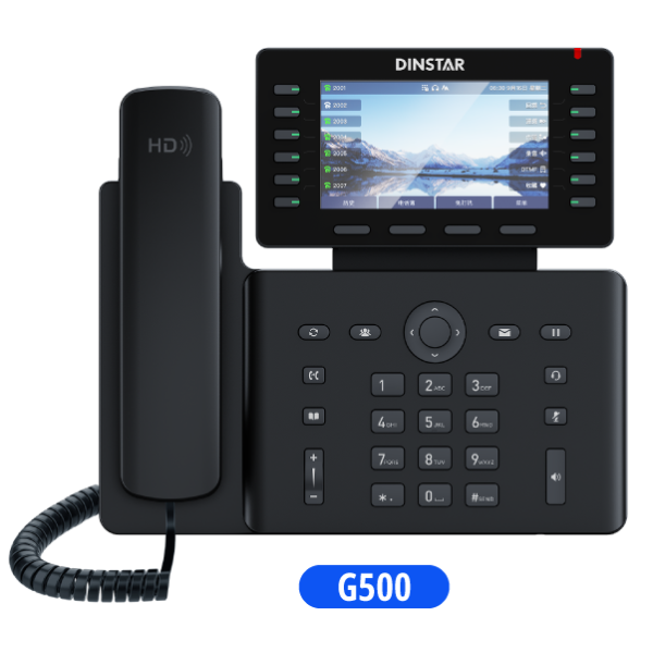 Dinstar G500, G500P & G500P adalah IP Phone enterprise premium dengan layar sentuh besar 4.3 inci dan dukungan hingga 20 akun SIP. Perangkat ini dirancang untuk kebutuhan komunikasi profesional tingkat tinggi dengan fitur lengkap, performa stabil, dan kualitas audio HD.