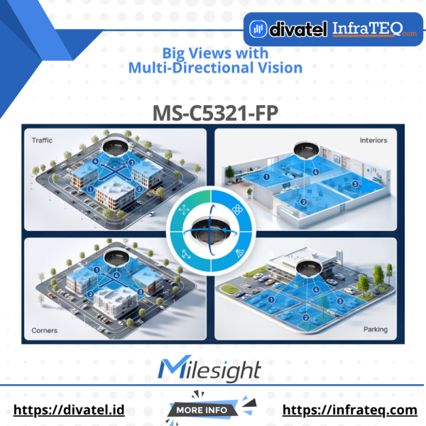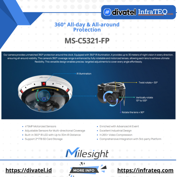 Dapatkan pengawasan 360° menyeluruh dengan Milesight MS-C5321-FPE, kamera AI multi-sensor beresolusi tinggi yang mampu menggantikan hingga empat kamera tradisional. Dengan lensa motorized 3,8–8,1 mm yang bisa diatur secara bebas (pan, tilt, rotate, twist), kamera ini ideal untuk area luas seperti pusat perbelanjaan, gedung bertingkat, halaman luas, dan proyek pengawasan industri